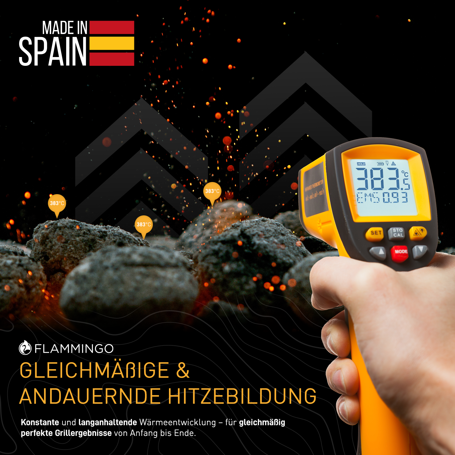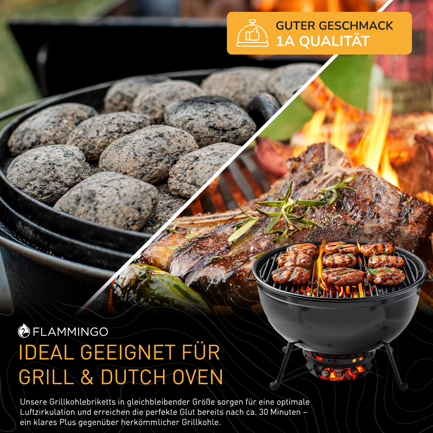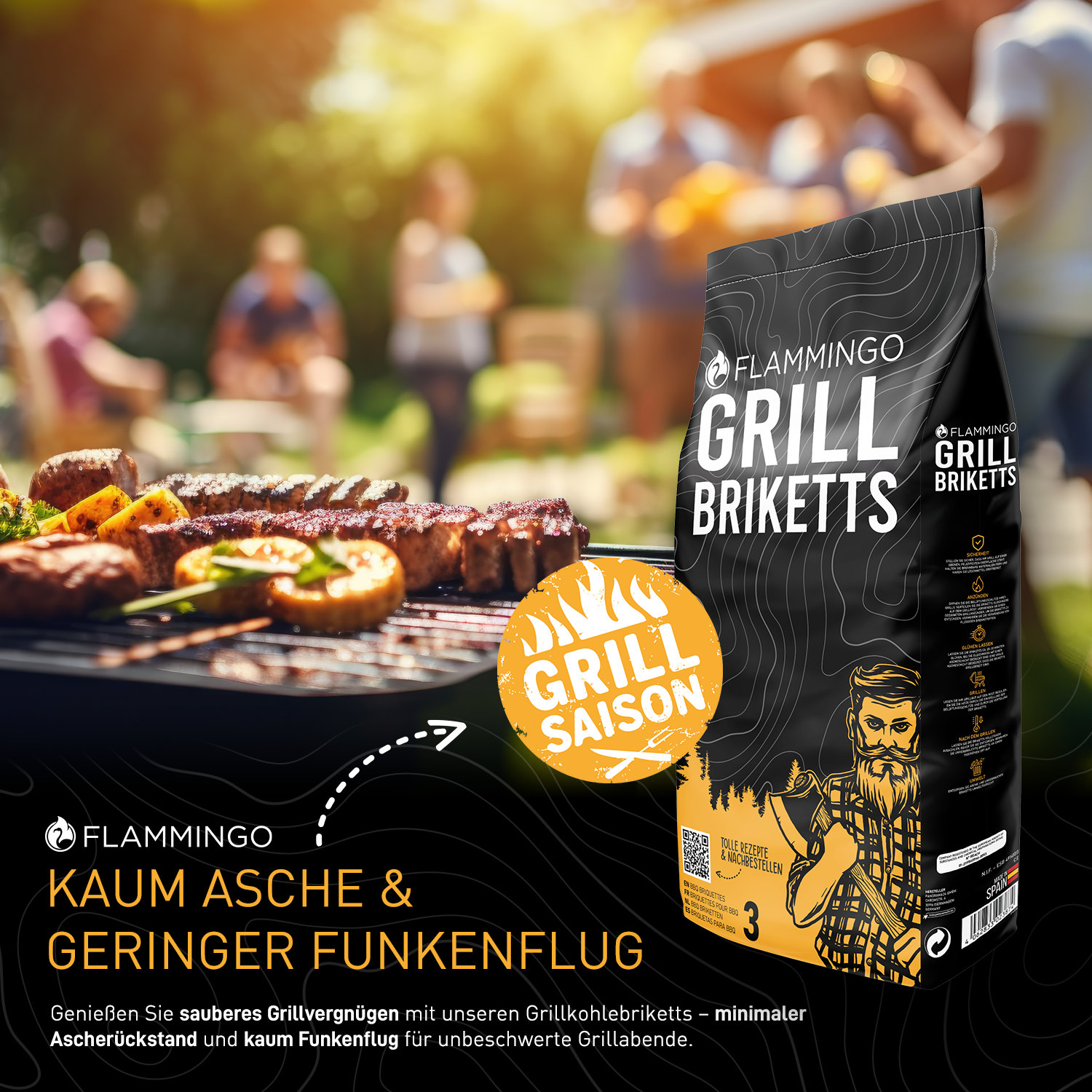 Bereit für den nächsten Grillabend? Entdecken Sie Holzkohlebriketts von Flammingo. Die Grillkohle zeichnet sich durch ein sparsames Abbrennverhalten und geringer Rauchentwicklung aus. Schnell entzündet bietet die fertige Glut eine hohe Standzeit bei ausgezeichneten Temperaturen. Nach der Verbrennung bleiben nur geringe Ascherückstände im Grill, die sich leicht entsorgen lassen. Ideal für fast alle Grills & Kugelgrills.