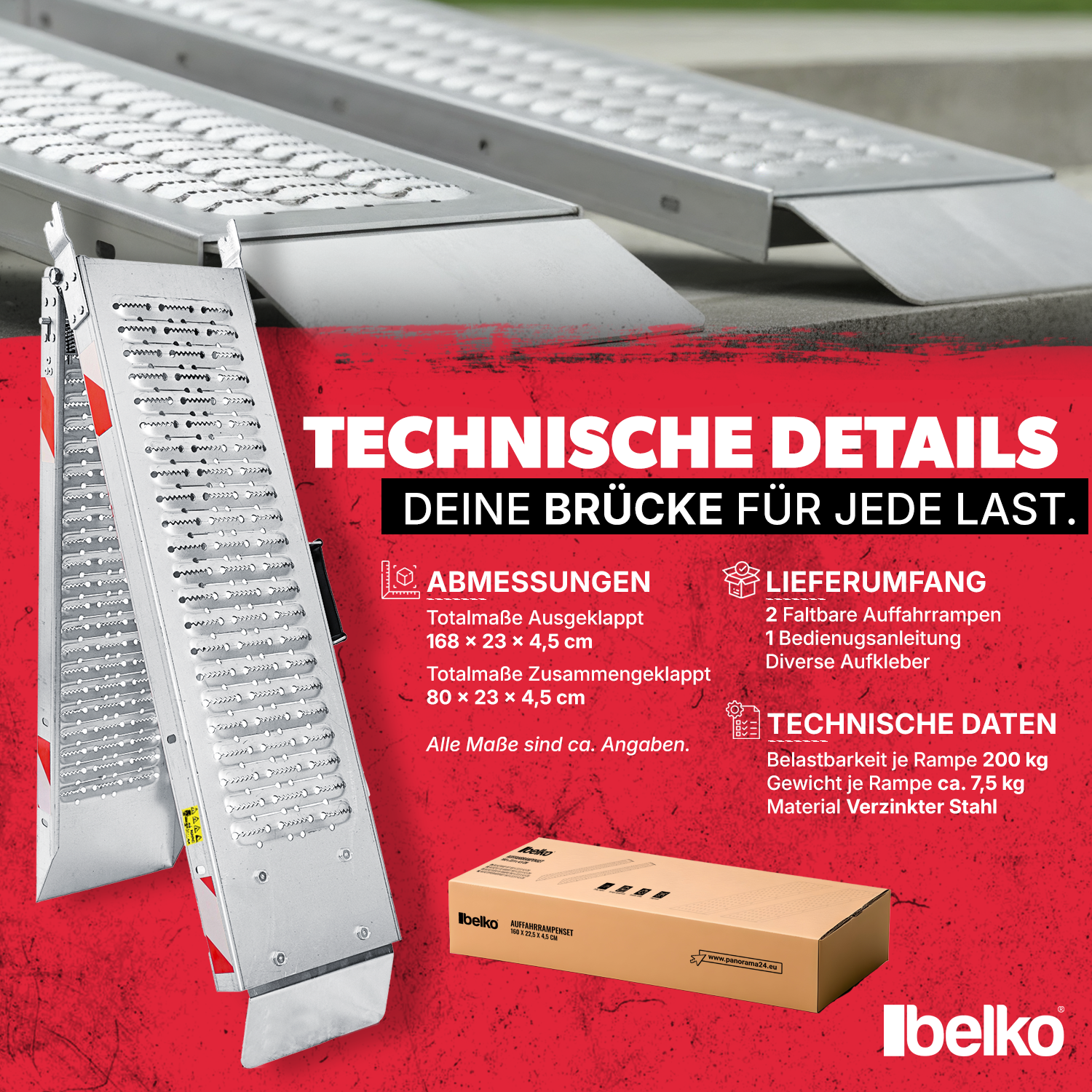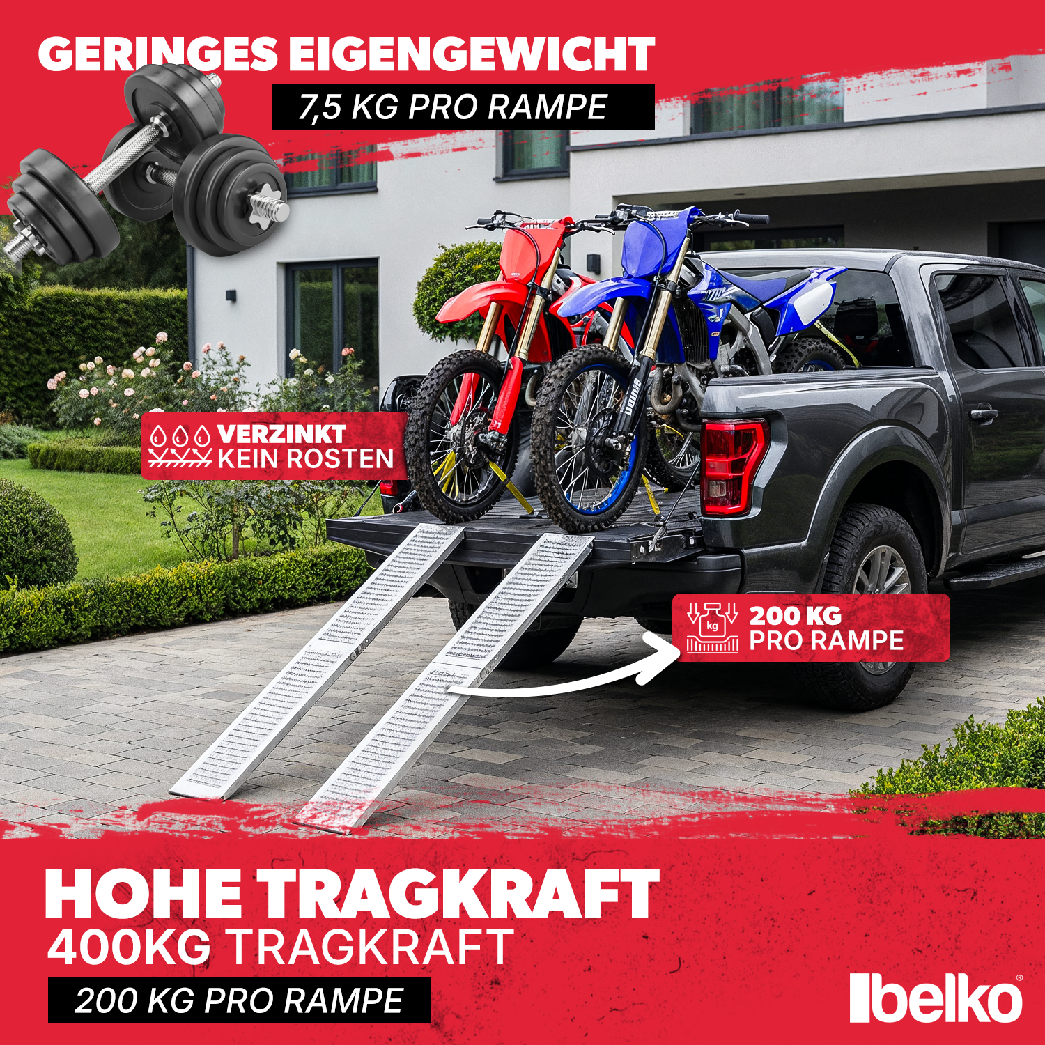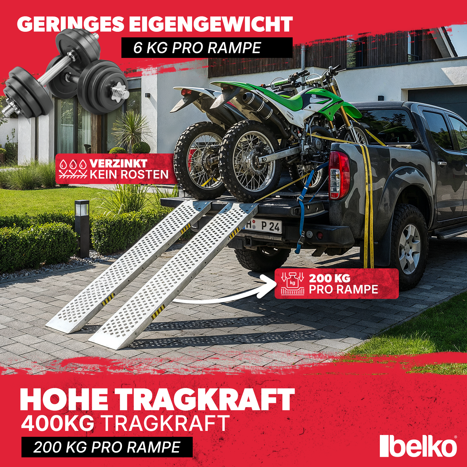 2X Auffahrrampe🧱 ROBUSTE STAHLRAMPEN MIT 400 KG GESAMTTRAGKRAFT: Die Belko® Auffahrrampen sind die ideale Lösung zum sicheren Verladen von Motorrad, Quad, ATV, Rasenmäher oder Rasentraktor. Gefertigt aus massivem, verzinktem Stahl, bieten sie höchste Stabilität und dauerhaften Rostschutz – perfekt für Werkstatt, Garage oder Anhänger.