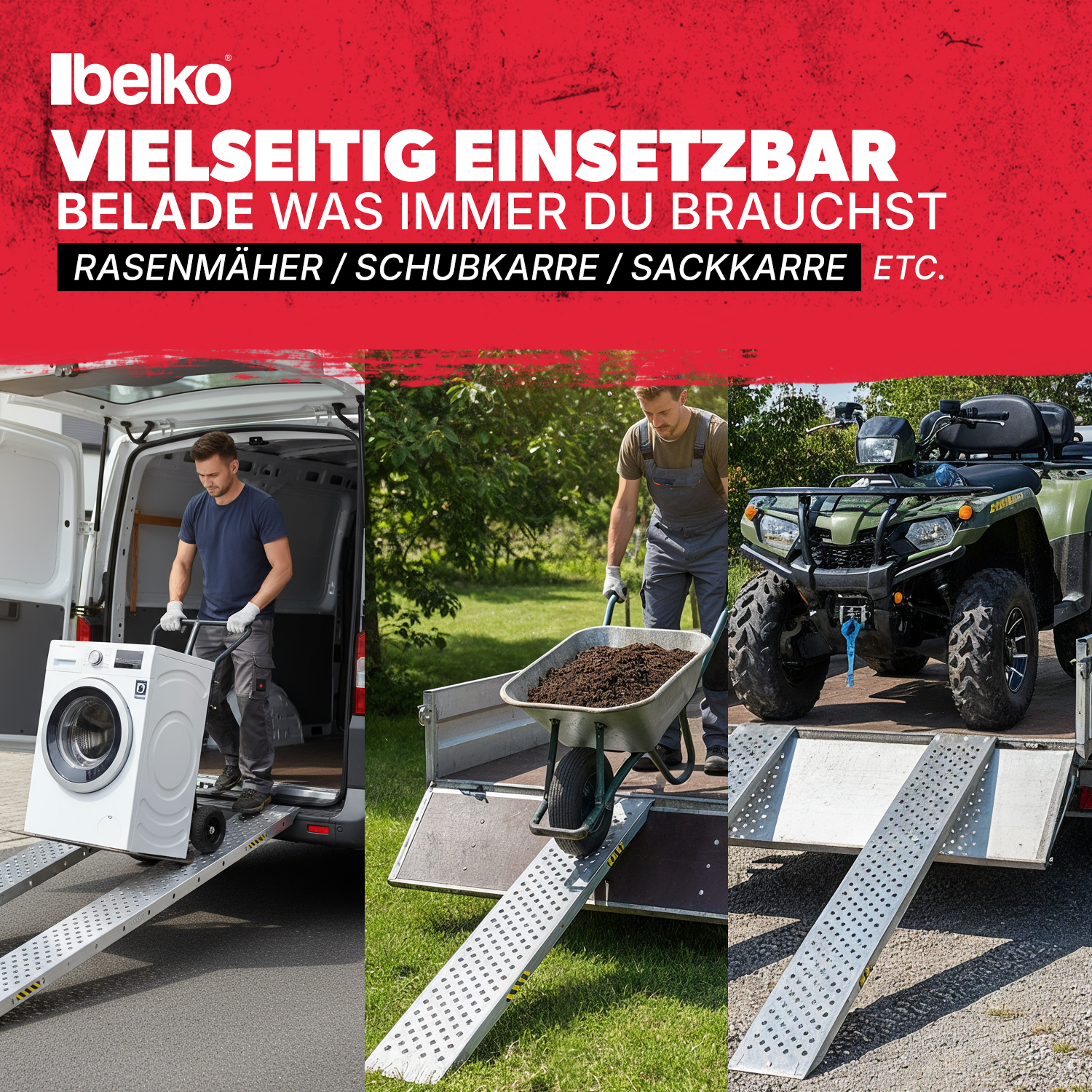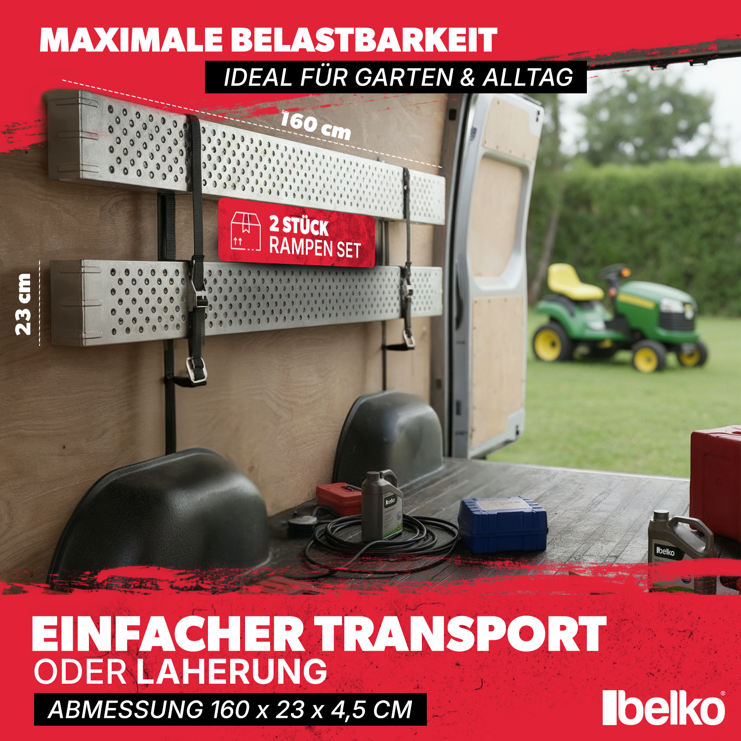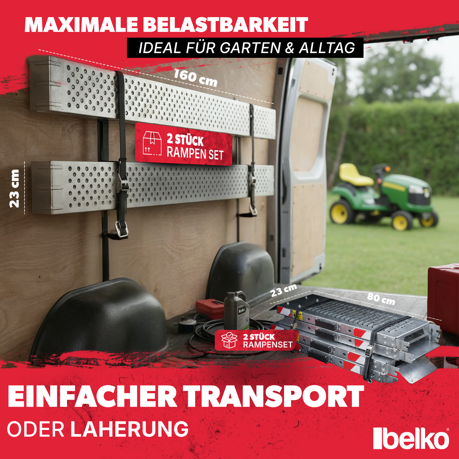 📏 PRAKTISCHE MAẞE & VIELSEITIG EINSETZBAR: Mit einer Breite von 23 cm pro Rampe eignen sich die Belko® Rampen perfekt für Motorräder, Quads, ATVs, Gartengeräte und Transportfahrzeuge. Ideal für Heim, Werkstatt oder Anhänger.